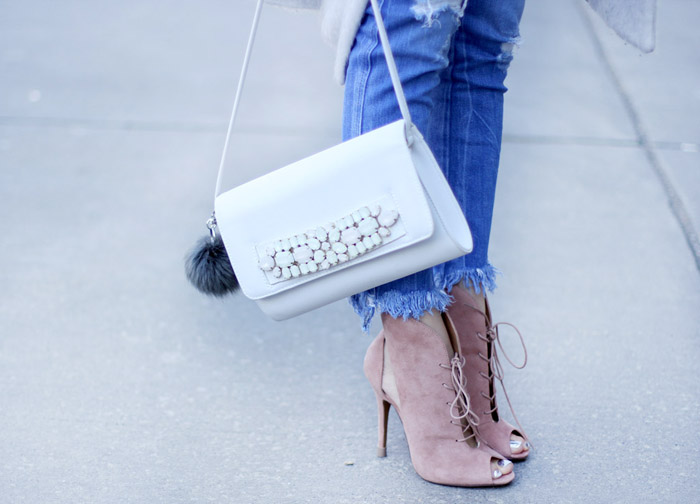 Pink peep-toes: c/o Chinese Laundry. Fringe Jeans: Zara. Coat: Max&Co. Purse: H&M. Jewelry: Winners& Shop for Jayu. Pom pom keychain: H&M. Nails: c/o Jamberry. Heel Protectors: Clickless. Necklace: SammyDress. Sweatshirt: old, similar styles below.